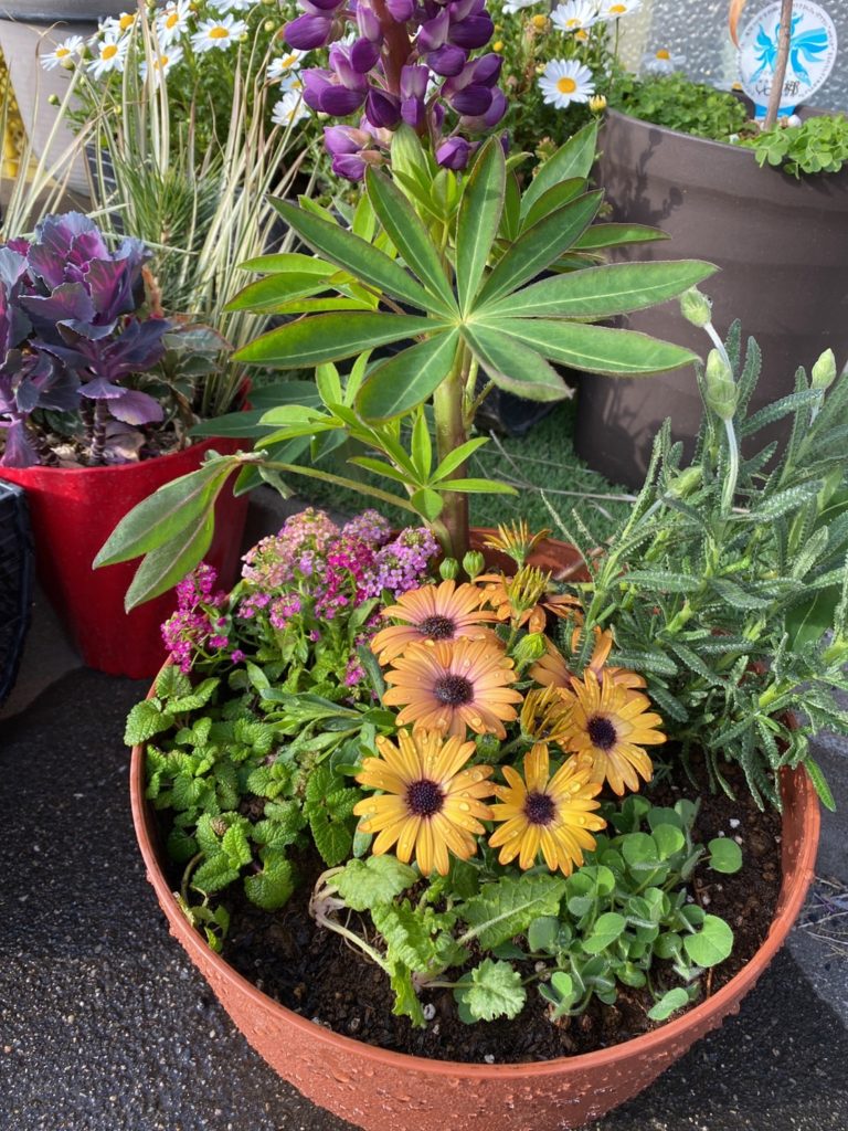 ルピナス、クリムゾンクローバー、オステオスペルマム、日本桜草、フレンチラベンダー、レモンバーム