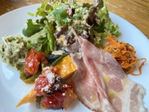 私は季節限定のズッキーニの冷製パスタを前菜、サラダ、デザートのセットで。